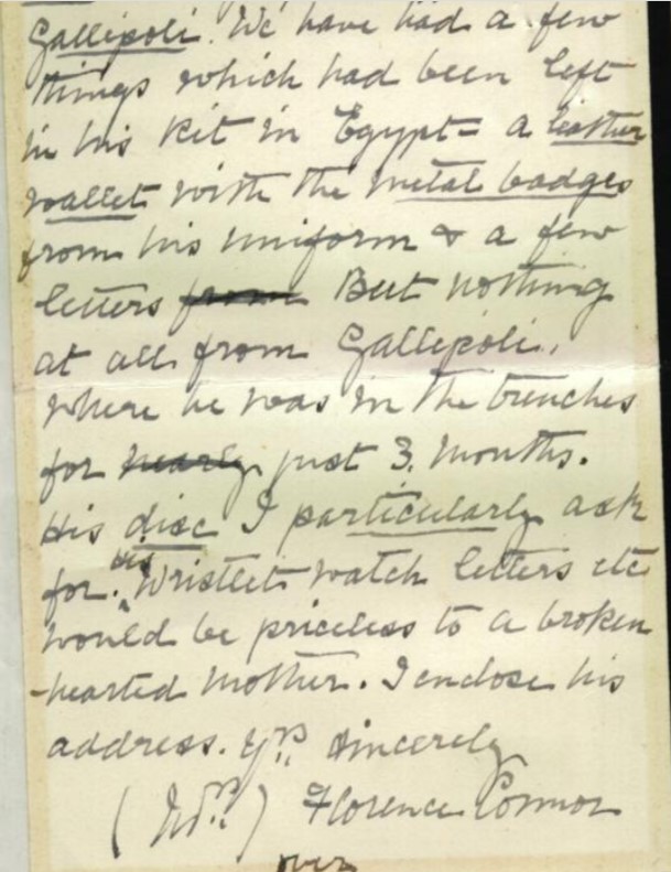 No answers were forthcoming but a list of names of members of the 8th LHR who had survived, and they were few, was passed on to Samuel. Later Florence wrote to the Defence Department. They had received some of their son’s possessions but not those which would have been with him at Gallipoli such as his identity disc.