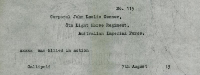 On 27 August 1915, Samuel and Florence Connor received a telegram stating Les was reported missing on 7 August. By the end of the week, another telegram arrived. Les was dead.