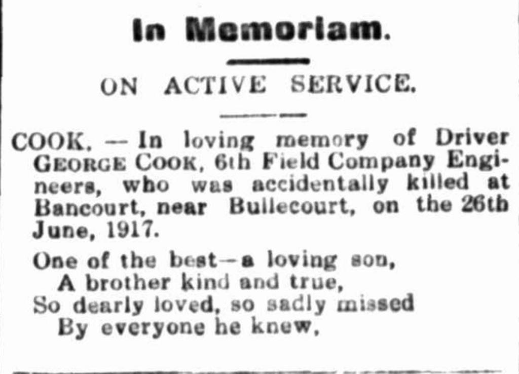 June 1917 was a quiet month for the company, so George could take leave on 2 June 1917 to England, returning on 17 June with the company, then at Bancourt near Bapaume, France. During the early hours of 26 June while on picket duty, George died from wounds from his own rifle. An inquiry was immediately held. The following is a witness statement from that inquiry.