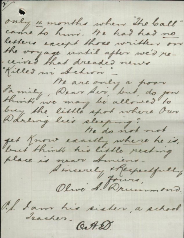 John’s sister Olive, a school teacher wrote several letters to General Paul Pau of France who toured Australia in 1918 including this one requesting to buy the “little spot where our darling lies sleeping”.