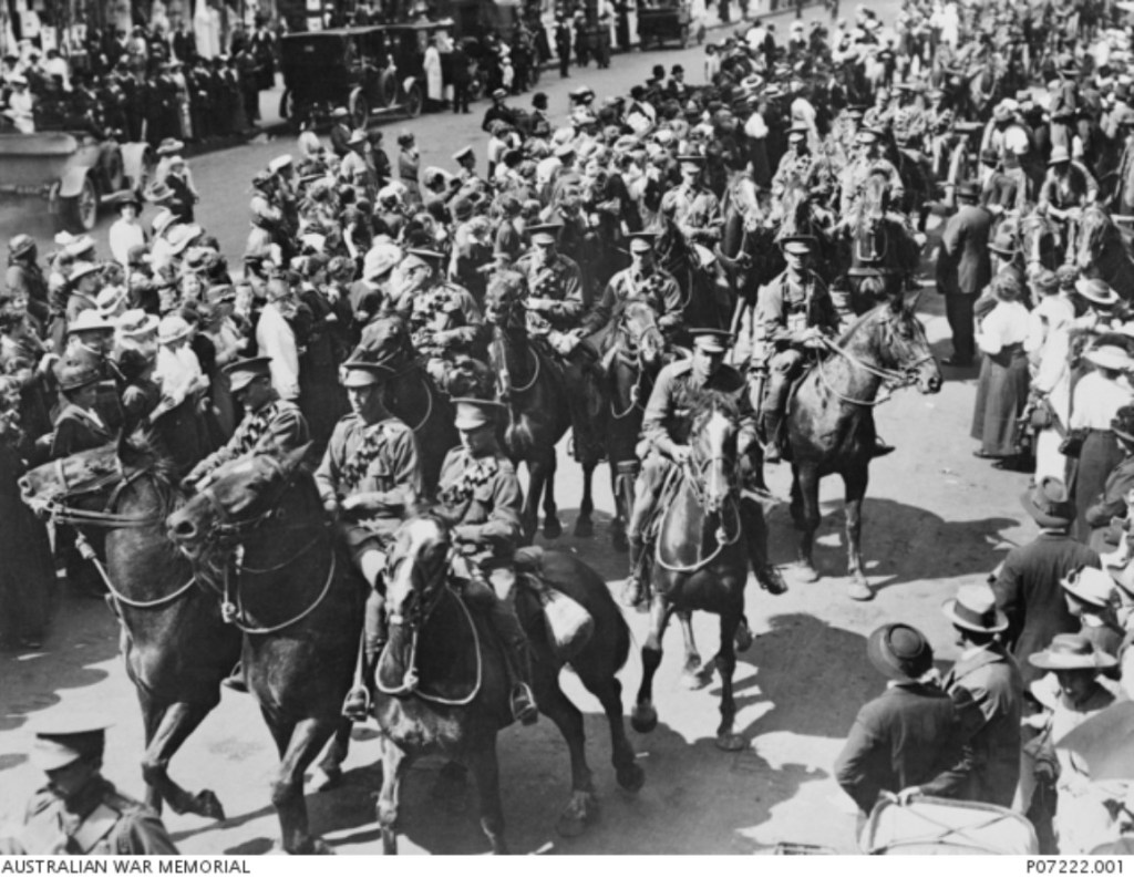 MEMBERS OF THE 4TH FIELD ARTILLERY BRIGADE, 11th BATTERY IN COLLINS STREET, MELBOURNE PRIOR TO DEPARTURE OVERSEAS. Image courtesy of the Australian War Memorial https://www.awm.gov.au/collection/C1223066