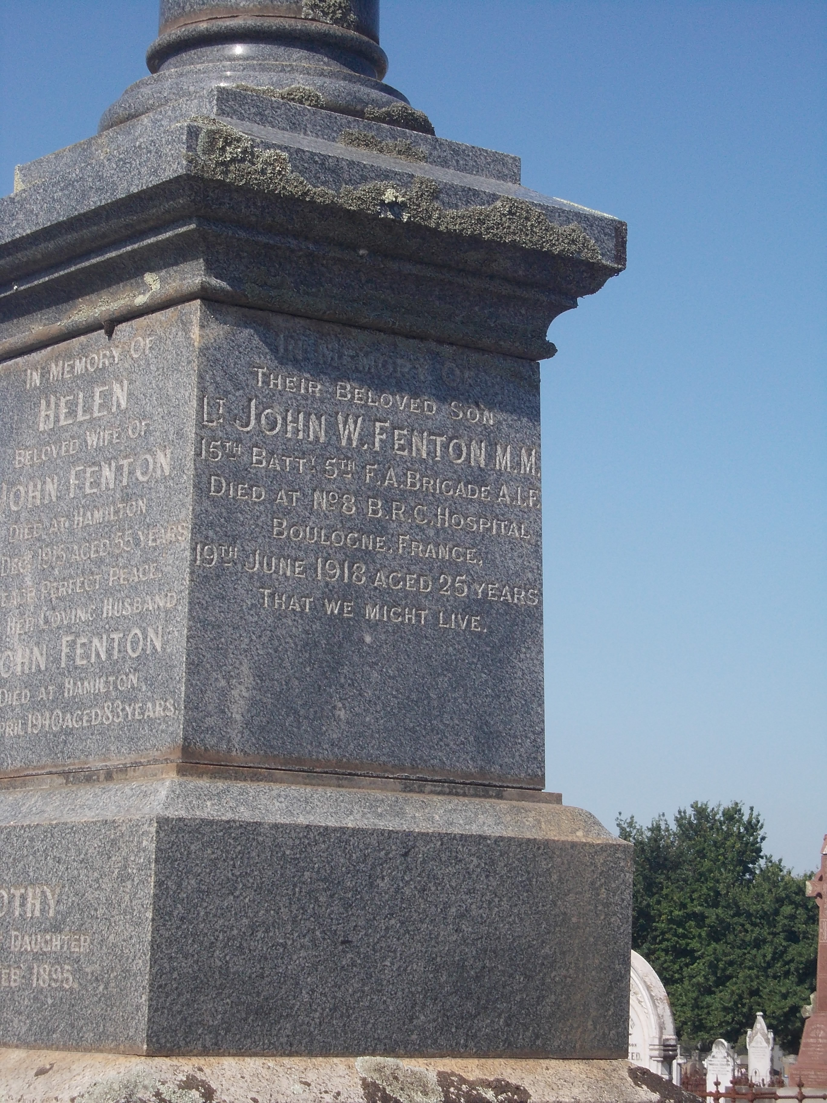 John is remembered on the Hamilton War Memorial and a tree was planted for him in 1918 along Clarke Street’s memorial avenue.  A memorial for John is also on the Fenton family grave at the Hamilton Old Cemetery.