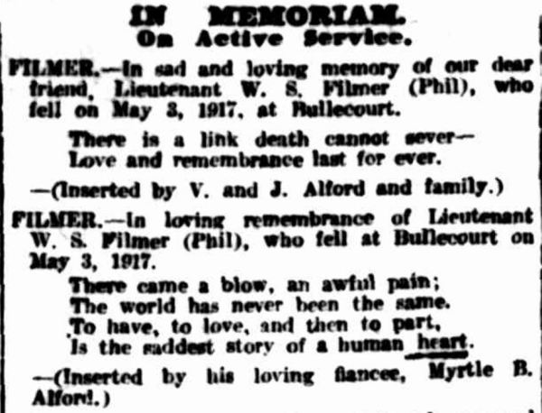 Rose Filmer heard the news of Walter’s death by the end of May. It was a sad time for the people of Byaduk with news coming through of another favourite son, Lieutenant Simon Fraser, killed on 11 May 1917, also at Bullecourt. And it was not just the Filmer family or the people of Byaduk feeling the loss. At Womerah too, there was much grief. The children of the Womerah School sent photographs to Rose of Walter while he was at the school. In Hamilton, Scotland the news of Walter’s death brought sadness especially as his death came so soon after his visit. Mr P.M.Kirkpatrick, the Town Clerk of Hamilton, Scotland wrote to the Town Clerk of Hamilton, Victoria expressing his sympathies.
