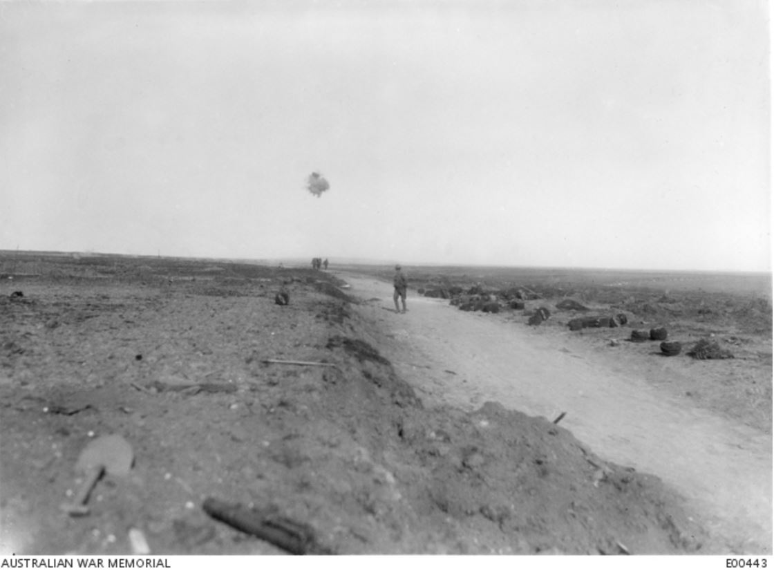 CLOSE TO THE LOCATION OF THE 2nd BATTLE OF BULLECOURT, 3 MAY 1917. A SHELL BURSTS IN THE DISTANCE. Image courtesy of the Australian War Memorial https://www.awm.gov.au/collection/E00443/