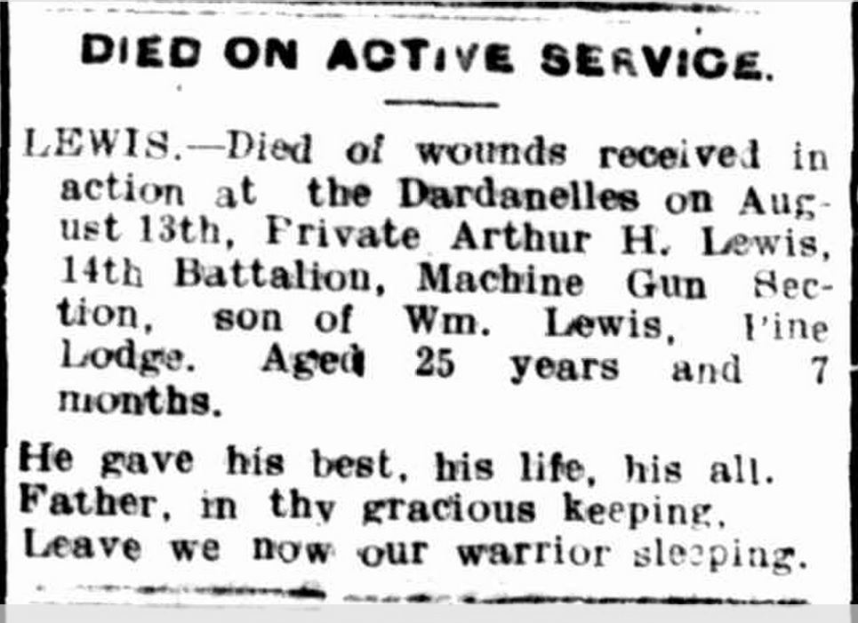 On 25 September 1915, the Hamilton Spectator reported that the Lewis family had received the first news that not only was Arthur wounded over a month before, but he had died from the wounds. The news came as a great shock to the Lewis family. William Lewis, in his grief, published a personal notice in the Spectator.