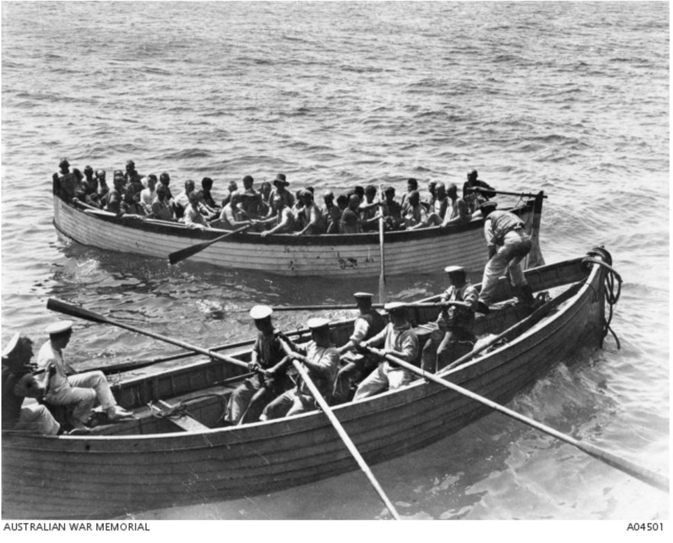 TROOPS IN LIFEBOATS AFTER THE SS SOUTHLAND WAS TORPEDOED ON 2 SEPTEMBER 1915. Image courtesy of the Australian War Memorial https://www.awm.gov.au/collection/A04501/