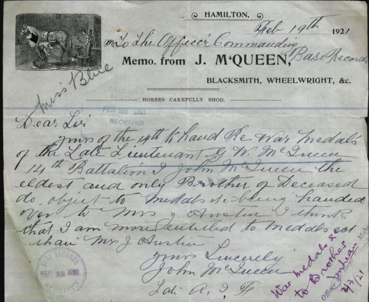 “THE LATE LIEUTENANT M’QUEEN” Hamilton Spectator (Vic. : 1870 – 1873; 1914 – 1918) 16 June 1917: <http://nla.gov.au/nla.news-article119851620>.