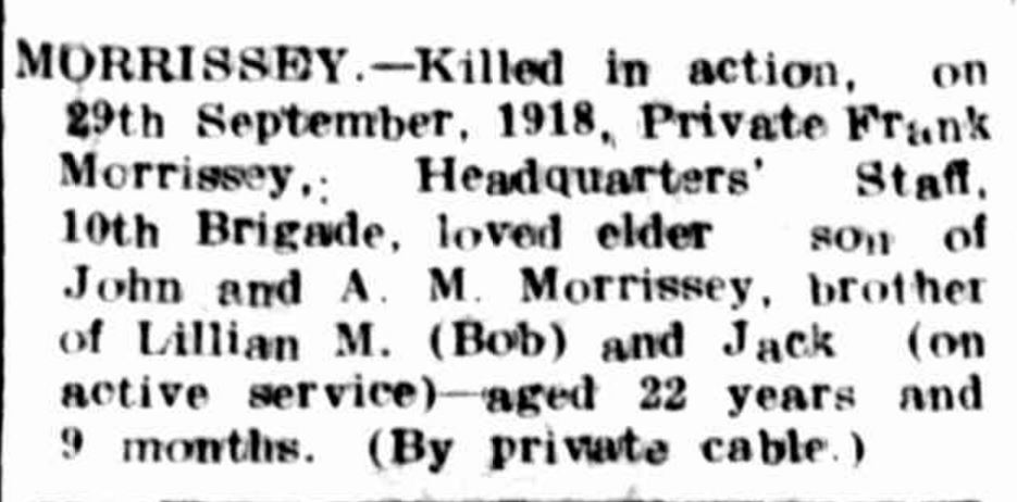 The allied forces ultimately broke through the Hindenburg Line but it came at a great loss of men. One of those killed was Frank Morrissey on 29 September 1918.
