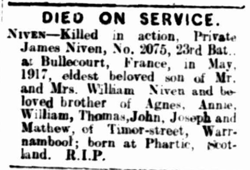 The next major battle for the 23rd Battalion was the 2nd Battle of Bullecourt from 3 May 1917. On 3 May, the battalion was part of an attack on Riencourt, just north of Bullecourt. They formed up at 3:30 am and moved forward fifteen minutes later. James was with the 10th Platoon of C Company. Heavy casualties came between 7:45 am and 11:00 am but the barrage kept up until 3:00 am the following morning. Seventy-nine men were reported missing, and one of those was James Niven. Witnesses said they saw him severely wounded by a shell in a trench. His body was never found.