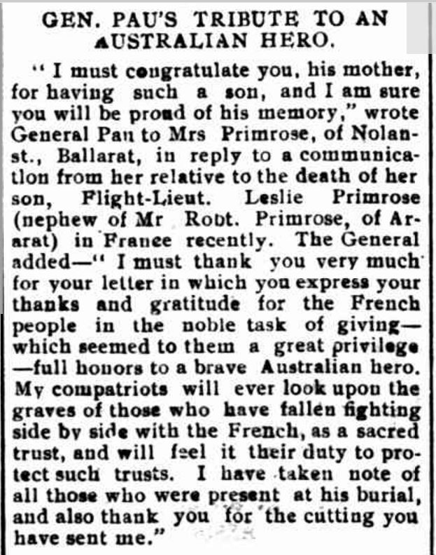“GEN. PAU’S TRIBUTE TO AN AUSTRALIAN HERO.” Ararat Chronicle and Willaura and Lake Bolac Districts Recorder (Vic. : 1914 – 1918) 8 November 1918: 2. Web. 18 Mar 2017.