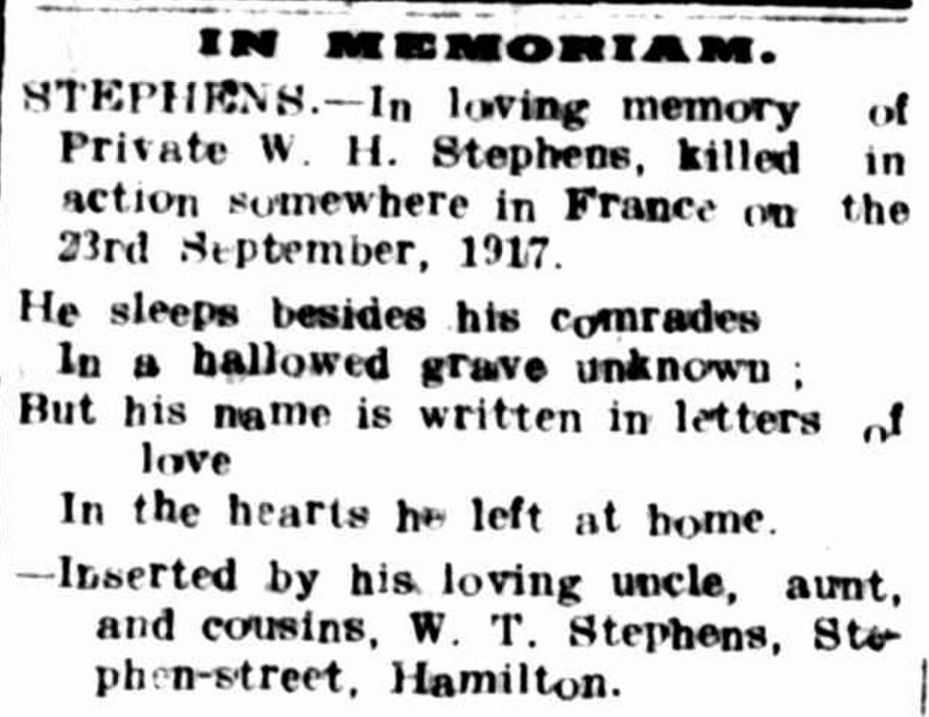 “Family Notices” Hamilton Spectator (Vic. : 1870 – 1918) 24 September 1918: 4. Web. 16 Apr 2017 <http://nla.gov.au/nla.news-article119506646>.
