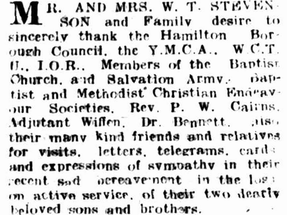 Back in Hamilton, William and Euphemia heard the news about Edgar around 25 October 1917. As if their grief could not reach greater depths, around 31 October, they heard Lex was also dead. They received much support from the Hamilton community, empathetic to the parents who had lost two sons in such a short space of time.