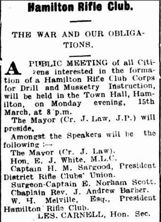 Life went on for Lex during that year and he participated in various activities around the town. He was a member of the Hamilton Miniature Rifle Club and Hamilton Rifle Club and competed successfully being one the better shots of both rifle clubs. In March 1915, the Rifle Club formed a Rifle Club Corp and Lex joined. He was a Section Commander under the charge of Sergeant Major Corbett.