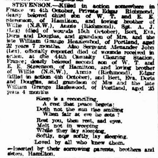 “Family Notices.” Hamilton Spectator (Vic. : 1870 – 1873; 1914 – 1918) 27 Oct 1917: 4. <http://nla.gov.au/nla.news-article119858833>.