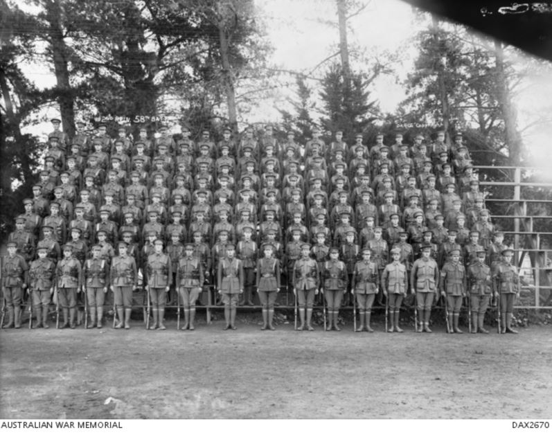 58th BATTALION, 2nd REINFORCEMENT. Image courtesy of the Australian War Memorial https://www.awm.gov.au/collection/DAX2670/