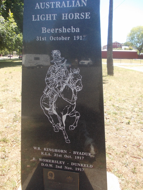 *The entry for the birth of Edgar Womersley on the Australian Birth Index (1788-1922), shows his mother as Mary Ann Womersley and father as Womersley. On his attestation paper, Edgar indicated his father was Harold Womersley of Parker Street Dunkeld. Harold Womersley was the father of Mary Ann Womersley. Mary Ann’s mother was Catherine Reegan, so Harold was Edgar’s grandfather. Edgar also gave his first name and signed his papers as Edward Womersley. Later entries in his service record revert to the name of Edgar. Also after his death, Edgar’s mother, Mary Ann applied for a war pension. That request was denied as she had not been dependent on Edgar for 12 months before his enlistment. Worth noting is that there were no “Family Notices” published after Edgar’s death maybe because of the complications of his family history. Considering that, it is fitting that Edgar Womersley has been given a special tribute on Hamilton’s Light Horse Memorial.