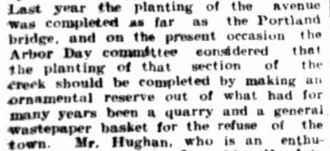 The plan for Arbor Day 1905 was to complete Victoria Avenue with another 100 trees. The secretary of the Arbor Day committee wrote a letter to the editor of the Spectator explaining the plans for the day, including planting, “…from the footbridge below Mr. Johns’ residence (Skene Street footbridge) to the Portland bridge.” On 21 June, the children again walked to the creek, this time via McIntyre and Skene Streets. They crossed the footbridge and proceeded along the south bank of the creek to the Portland Road bridge to join the other volunteers and the official party.