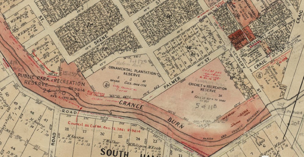 The park is east of the Skene Street footbridge and referenced as “Ornamental Plantation Reserve” in the Hamilton township map below.