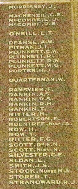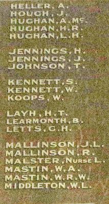 KNIGHT, Thomas Leonard – Most likely James Alfred Knight (Service No. 3835) who was killed in France on 8 June 1916 and for whom a tree was planted along Anzac Avenue in 1917. Thomas Leonard Knight was the younger brother of James Alfred Knight, sons of Thomas Robert Knight and Agnes Mason. Thomas Leonard married Agnes Mary Kenny in 1902. The Hamilton Spectator of 7 January 1915, reported Thomas Leonard Knight had enlisted on 6 January 1915 pending a medical likely held on 7 January 1915 by Hamilton’s Dr Norham Scott. If it was the same Thomas Leonard Knight he’d have been thirty-eight years old at the time, the maximum age for enlistment. There are no service records for Thomas Leonard Knight. That suggests he failed the medical on 7 January 1915. Thomas Leonard Knight died at Footscray in 1945 aged sixty-nine. T.L.Knight is also listed on the Hamilton War Memorial where only the names of those who didn’t return are included and among those who died on Borough of Hamilton Honour Roll.