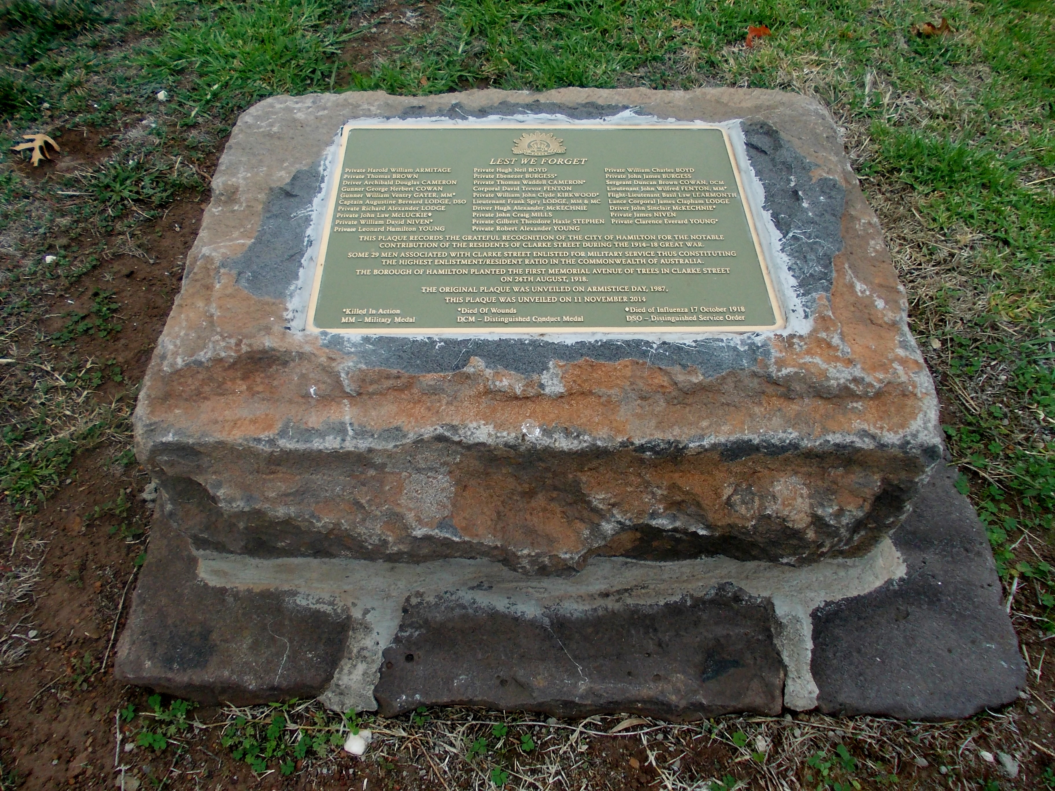 On 11 November 1987, a commemorative plaque (plaque) was unveiled in Clarke Street to recognise the planting in 1918.