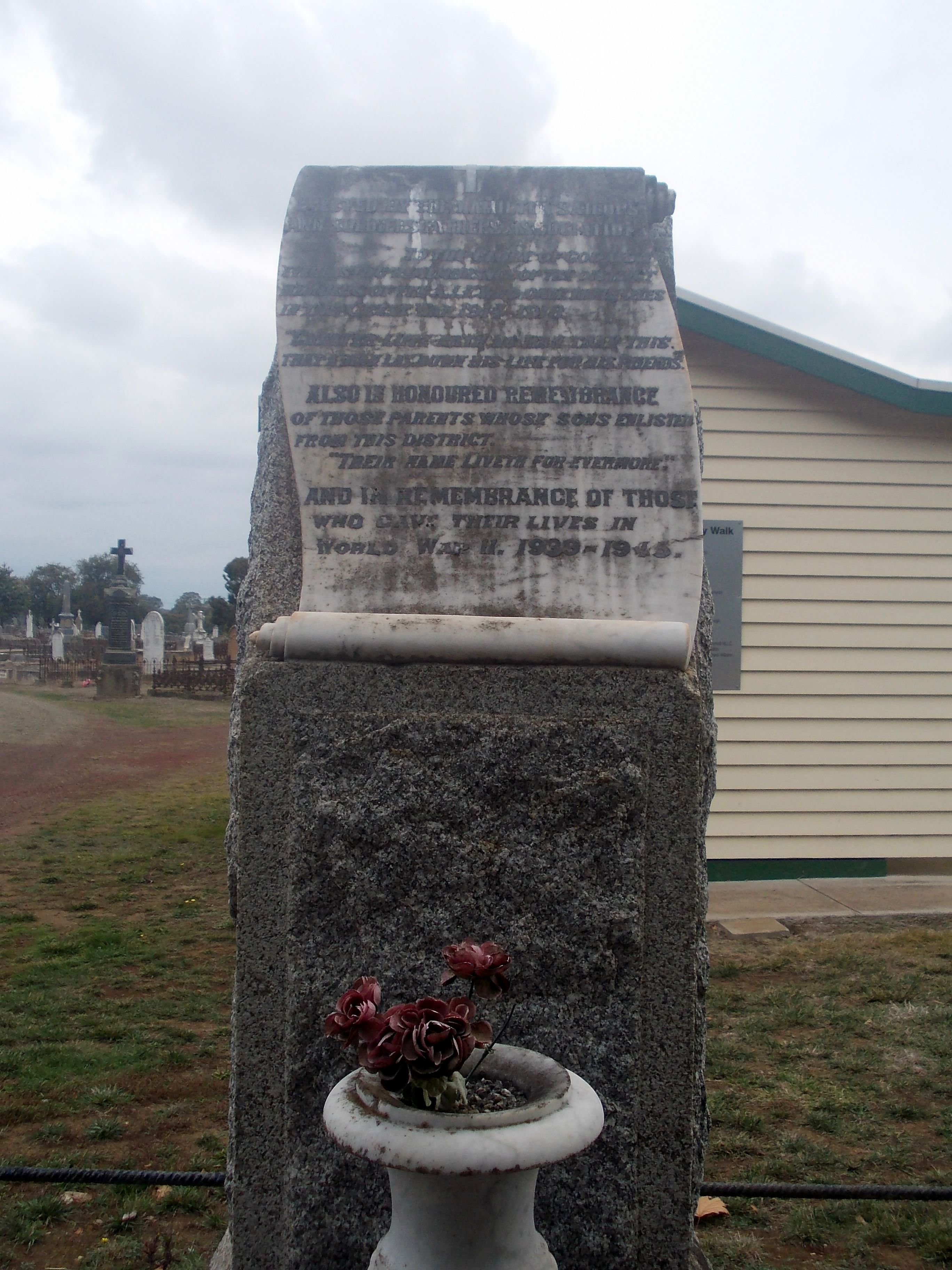 The first meeting of the Hamilton branch of the Sailors’ and Soldiers’ Fathers’ Association was held on 26 October 1918. Mr Alfred Tatlock was the convener of the meeting and was elected as chairman. On 5 May 1922, a monument was unveiled by Col. The Right Hon. George Edward John Mowbray Rous, Earl of Stradbroke, Governor of Victoria, just inside the gates of the Hamilton Cemetery to remember the sons who had fallen during WW1. Those who served during WW2 were later honoured on the memorial.