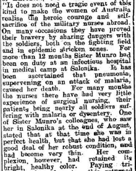 Before the year was out, Edith’s youngest brother Eric left Australia. For Edith and the other nurses at Salonika, living conditions were poor, some even thought worse than France. There was very little fresh food and they lived off soldiers’ rations. To give their iron levels a boost, a weekly ration of bully beef and biscuits was issued. Winters were freezing and the summers were hot with malaria was a constant risk. The nurses had to cover themselves from head to toe to protect themselves from mosquitos. An article in the Ballarat Courier reporting on the death of Sister Munro at Salonika touched on the bad conditions they were living under.