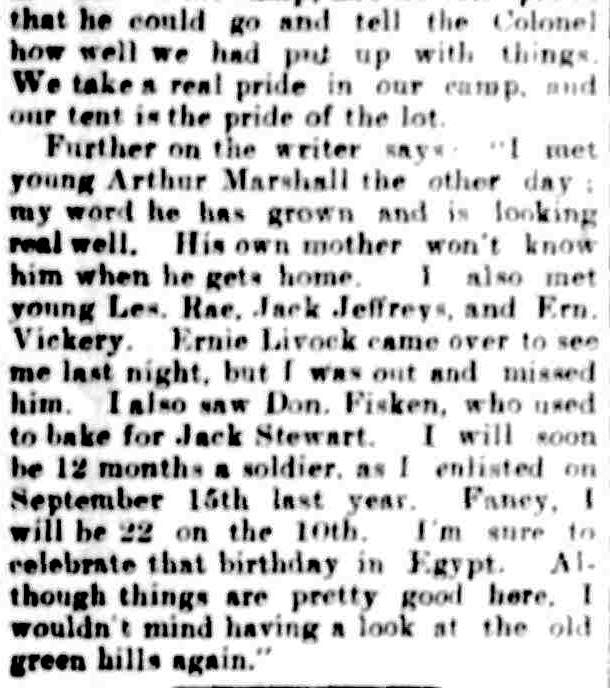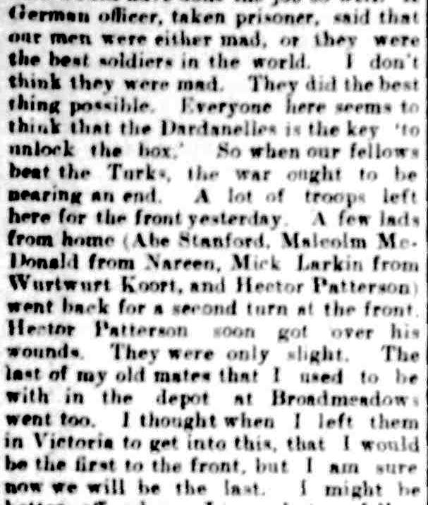 Following is a letter home by Norman Seymour to his mother in Casterton. He wrote of his brother James, and the pride he felt that James was at “the great landing at Gallipoli”. This is a great example of how useful these letters are. Norman wrote of many men from the local district including Hector Patterson and his wounds.