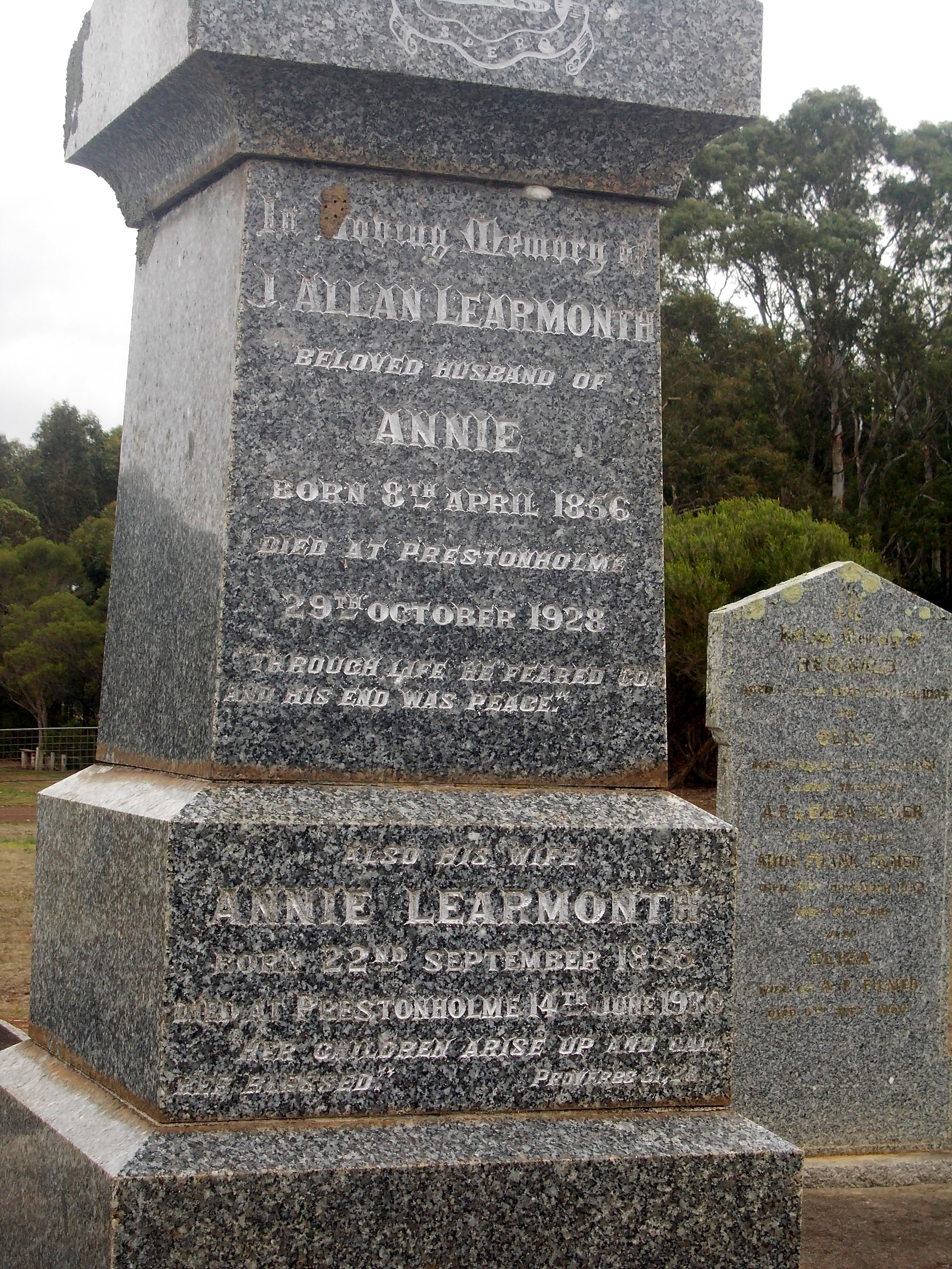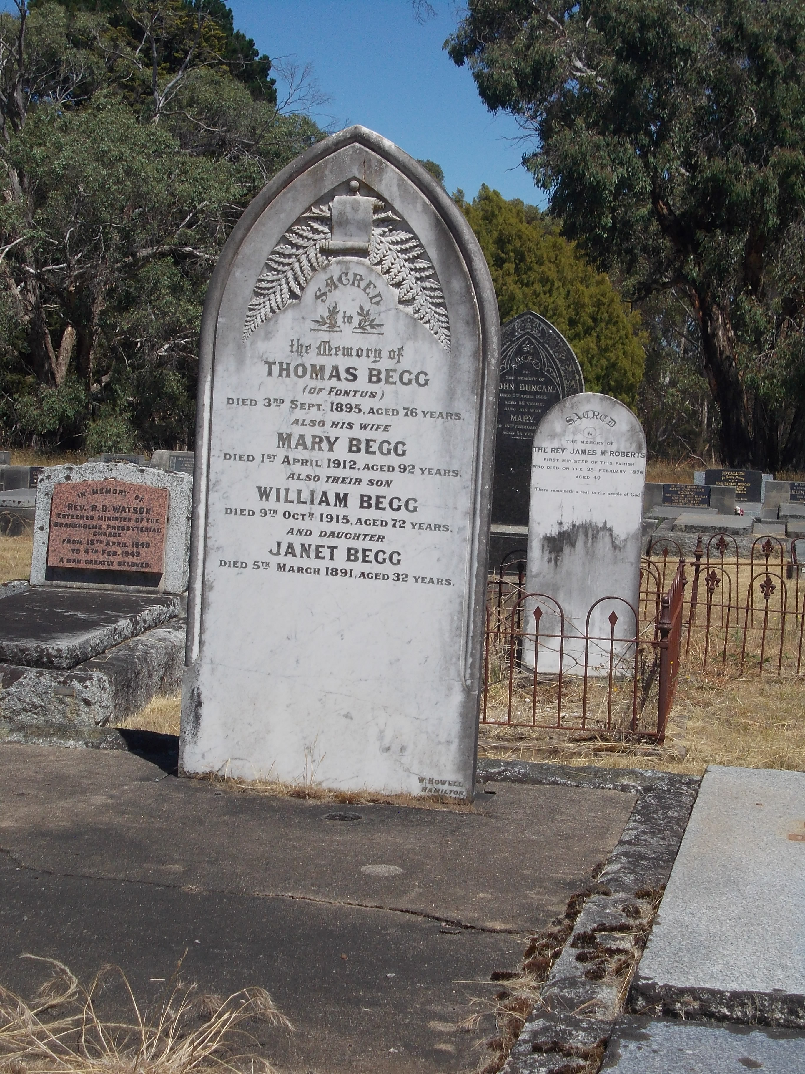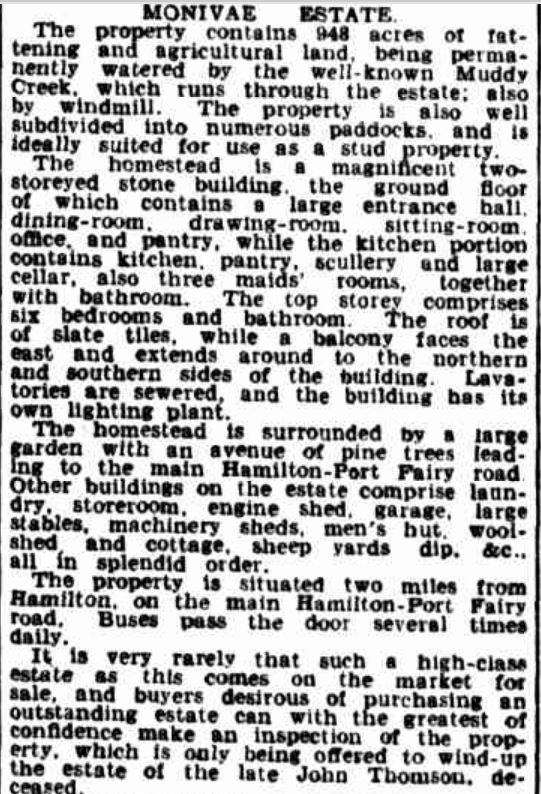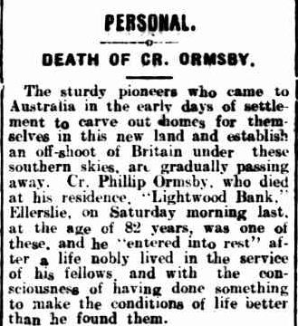 Around 1900, William and Elizabeth retired to Portland where William was a member of the bowls and golf clubs. He also had an interest in political happenings and was a past member of the Hamilton Farmers Union in the 1880s. Elizabeth died in 1912 at Portland. William remarried to Theresa Lear in 1913. They were living in Cameron Street, Portland when William died. He left his widow Theresa and three daughters from his first marriage.