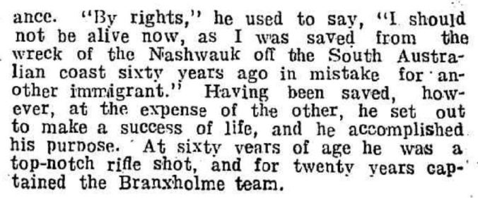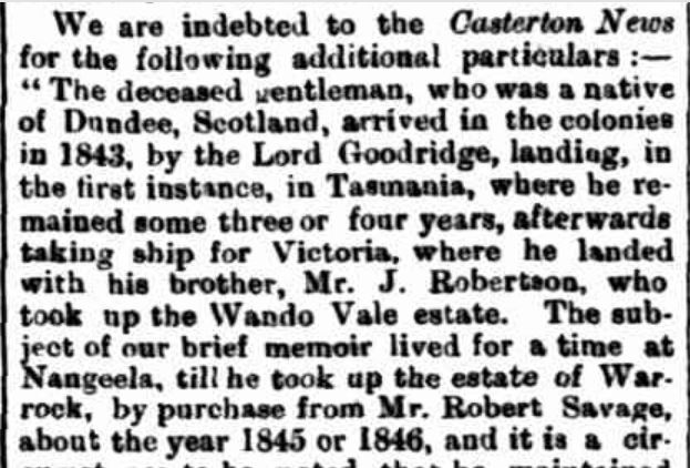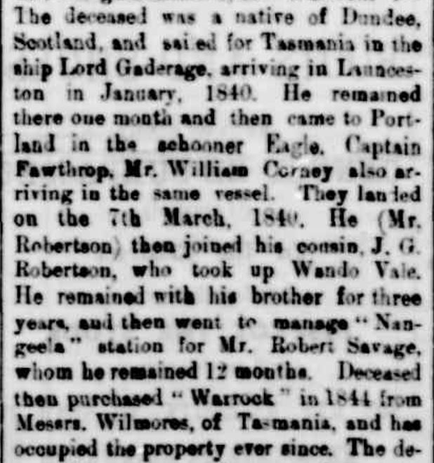 The Hamilton Spectator/Casterton News stated George arrived in Van Diemen’s Land (Tasmania) in 1843 aboard Lord Goodridge, staying there three or four years before travelling to Victoria with his brother J. Robertson “who took up Wando Vale estate”. Meanwhile, the Portland Guardian stated George had sailed on Lord Gaderage arriving in Van Diemen’s Land in January 1840 where he stayed a month before sailing to Victoria on Eagle captained by Captain Fawthrop of Portland. A fellow passenger was William Corney and they landed at Portland Bay on 7 March 1840. It continues…”He then joined his cousin J.G. Robertson who took up Wando Vale estate. He remained with his brother for three years…”.