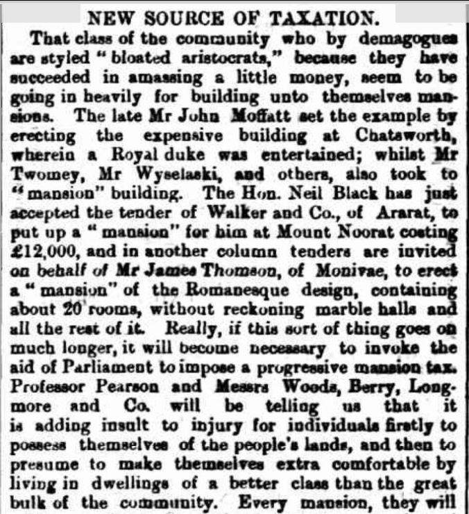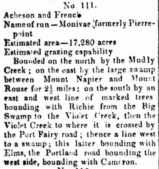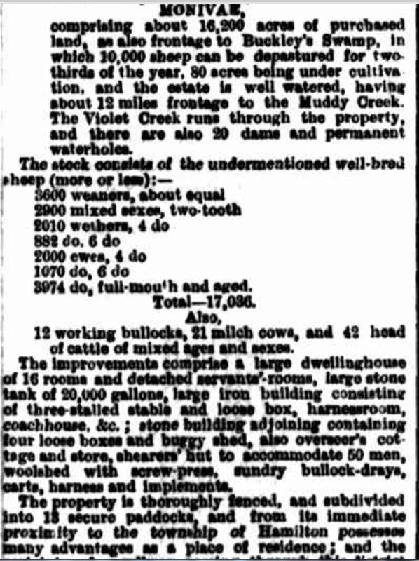 In contrast to the Portland Guardian, the Casterton News/Hamilton Spectator obituary stated George travelled to Victoria in 1843 with his brother J.Robertson. The Portland Guardian had a bet each way as to whether George had a brother J.Robertson stating after George arrived in 1840, he went to stay with his cousin J.G.Robertson, staying three years with his brother. The Casterton News/Hamilton Spectator continued, suggesting after his 1843 arrival he then went to Nangeela, west of Wando Vale estate. Although not mentioned in the obituary, Nangeela was held by Robert Savage in 1843 with Captain Robert Dana. But the Casterton News/Spectator went on to say George purchased Warrock from Robert Savage in 1845 or 1846. However, William Wilmore owned Warrock at the time of George’s purchase, supported by the Portland Guardian obituary which said George purchased Warrock in 1844, the generally accepted year.