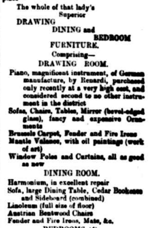 In May 1886, the Camperdown Chronicle announced Eliza was leaving the district and selling her home in Brooke Street along with her furniture including a German-made piano, a harmonium and even the curtain rods.