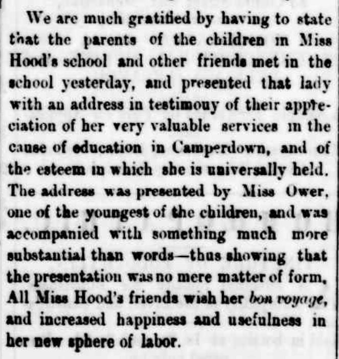 Eliza’s father John Hood was a doctor and he set up a practice in Camperdown. When Eliza was older she opened the Camperdown Ladies’ College. In 1878, she was given a farewell as she was off to New Zealand to take up employment at the Invercargill Ladies High School.