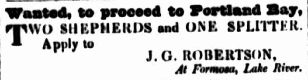 But was it John Robertson not George Robertson on Eagle? There’s a good chance it was John. Not only was there stock belonging to John on the ship but it’s likely at least two if not all the shepherds on Eagle were off to Portland Bay to work for John. Only a month before the Eagle departed John Robertson, then living at Lake River in Van Diemen’s Land, advertised for shepherds and a splitter to go to Portland Bay.