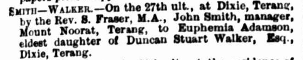 Euphemia Adamson WALKER – Died 23 January 1937 at Hamilton. Euphemia Walker was born at Dixie Estate, Camperdown around 1856. Her father was Duncan Walker. In 1881, Euphemia married John Smith, manager at The Sisters and later Mount Noorat for Niel Black.