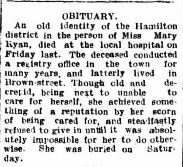 When I wrote about Mary Ryan for Passing of the Pioneers, there was little known about her other than she ran a servants’ registry office in Hamilton and she died ten months after a fire burnt down her home. I also gathered from her short obituary, she was very independent. Mary never married and living a seemingly solitary life, save for the interactions through her business. When Mary died there was no-one to give the names of her parents, so her death record shows her parents as “unknown”. Since her Passing of the Pioneers appearance, more Hamilton Spectators have become available at Trove and I’ve been able to find out a little more about Mary.