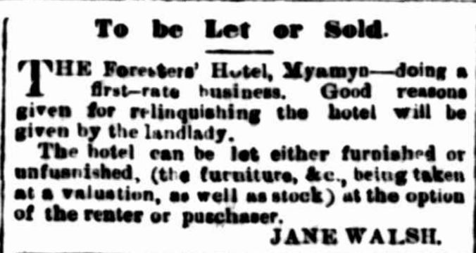 Jane Donnelly was born in Ireland around 1834 and arrived in Victoria in the early 1860s. She married William Walsh in 1865 and together they operated the Forester’s Hotel at Myamyn. Jane and William had three children before William died in 1877 aged forty-nine. It was the same year a fourth child was born. Jane continued to run the hotel although she did try to sell it. In 1881, the hotel was badly damaged by fire leading to Jane’s insolvency in 1881 with debts of £145.
