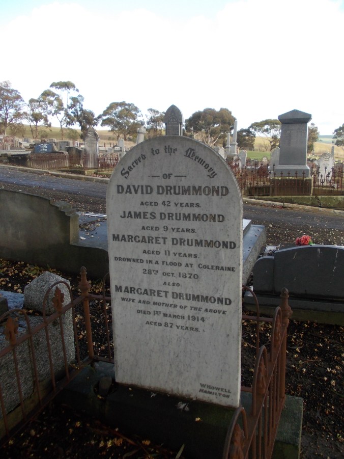 DRUMMOND, Robert George – Died 13 July 1924 at Hamilton. Robert Drummond was born in 1869 at Coleraine, the son of George and Margaret Drummond. George operated Coleraine’s Shamrock Inn until 1876, then the Koroite Inn. A year after Robert’s birth, in 1870, his sister, uncle, and cousins drowned when flood water inundated their home at Coleraine. In 1882, when Robert was thirteen, George Drummond died. Robert went to school in Coleraine before working for a short time for James Trangmar in his store in Coleraine, next door to the Koroite Inn.
