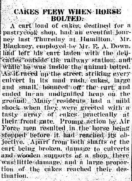 Mr Blackney, was left with cake on his face after an incident in Hamilton in 1942. While his back was turned, his horse bolted, pulling a cart laden with cakes.