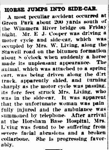 HORSE JUMPS INTO SIDE-CAR. (1932, April 19). The Horsham Times (Vic. : 1882 – 1954), p. 4. Retrieved October 18, 2012, from http://nla.gov.au/nla.news-article72600659