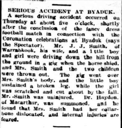 After a fun day at the Byaduk Coronation Celebrations in 1911, which included a fancy dress football match, the Smith Familyof Warrabkook met with disaster while travelling home.