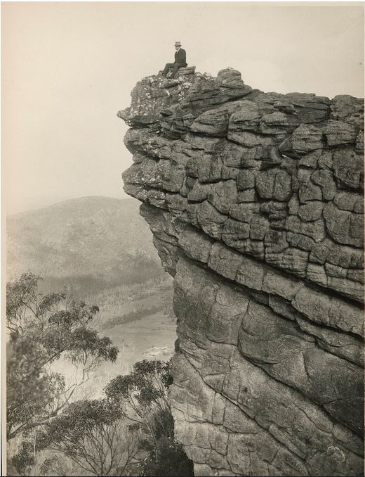 The gentleman in the photo is not as daring as Halls Gap photographer, Gilbert Rogers (1880-1950). A photo in Ida Stanton’s book Bridging the Gap: the history of Halls Gap from 1840 (1988) shows Gilbert hanging from a ledge below the Pinnacle, with his camera and tripod, capturing the best views of the mountains. Crazy.