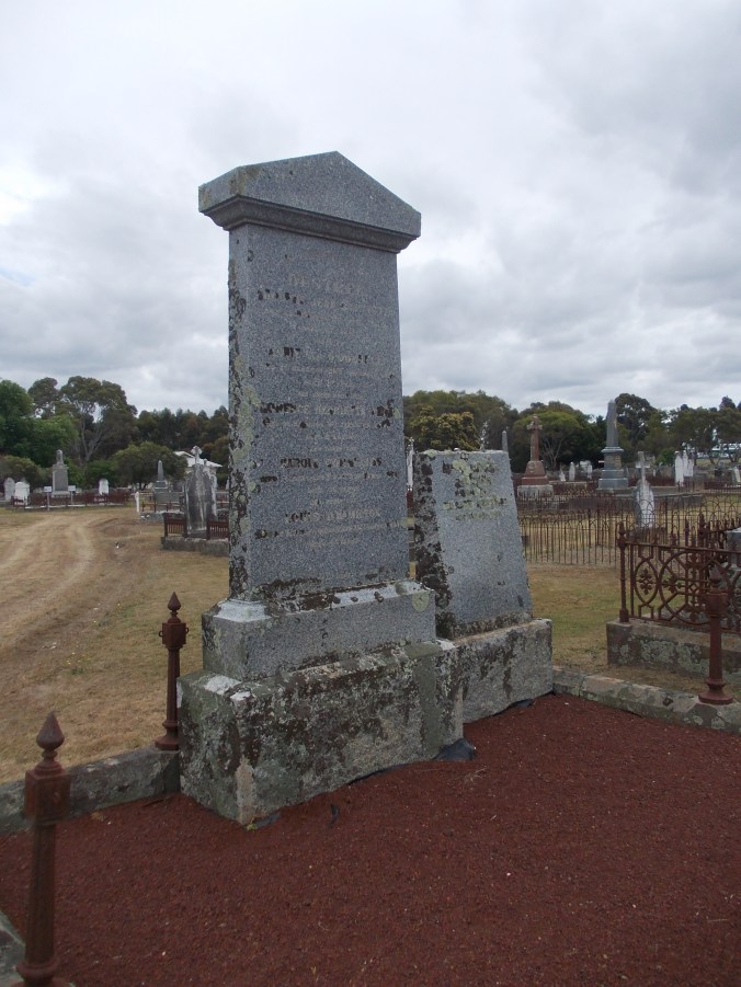 KERR, Elizabeth Adams – Died 1 June 1913 at Hamilton. Elizabeth Kerr was born in Glasgow, Scotland around 1833. She arrived in Sydney with her parents in November 1841 aboard the Trinidad. Her father Thomas Kerr was a police constable in Sydney but he took up a job of customs officer at Portland which saw the family’s move to Victoria. In 1850, Elizabeth married Walter Herd and they moved to the Coleraine district. They raised a family of five daughters but Walter died in December 1876 and was buried at the Coleraine Cemetery. In 1878, Elizabeth married Thomas Penhall in 1878 and she continued living at Coleraine. Thomas died in November 1912 so Elizabeth moved to Hamilton to live with her cousin Albert Kerr of Lonsdale Street. She died there on 1 June 1913 leaving five daughters.