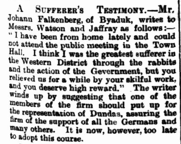 On several occasions, Johann wrote letters to the editor of the Hamilton Spectator. In 1874, he wrote of the plight of the selector farmer competing for land against the graziers.
