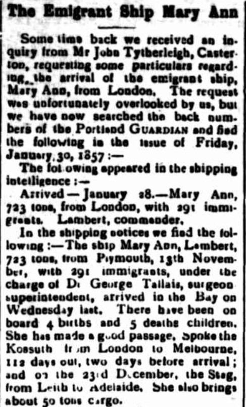 In 1907, a son of Robert and Susan, John Tytherleigh must have been doing some family history research when he wrote to the Portland Guardian, hoping to find out the details of the arrival of the Mary Ann in 1857. The Guardian in response reprinted the shipping details from the papers edition of 30 January 1857.