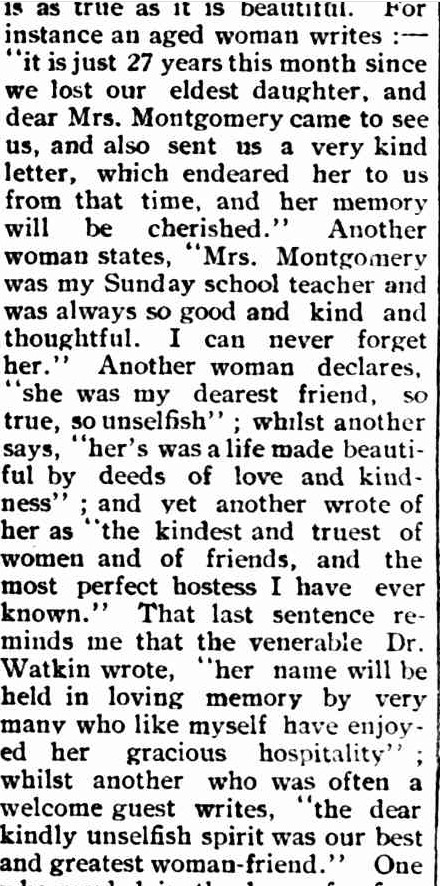 In September 1916, a memorial tablet for Hester was unveiled at the Mortlake Methodist Church. Thomas had remarried the year before to the widow of the Reverend H.J. Brownell, the former minister of the Terang and Mortlake Methodist Church who died in October 1898. Thomas Montgomery died in March 1920.
