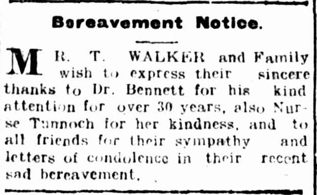 AUSTIN, Harriet – Died June 1917 at Hamilton. Harriet Austin was born in Huntingdonshire, England around 1837. She married Thomas Walker and they had two children before they boarded the Ocean Home for Victoria in 1860. On arrival, the Walkers headed for Hamilton settling in North Hamilton. Around 1907, Harriet and Thomas took up residence in Collins Street, Hamilton. Harriet died in late June 1917 and was buried at the Hamilton Cemetery on 26 June. She left her husband Thomas and five sons and two daughters. Thomas placed a Bereavement Notice in the Hamilton Spectator.