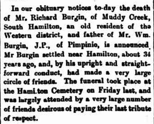 Nearby the grave of William and Sarah is the last resting place of Sarah’s parents Richard Burgin and Eliza Addinsall. They were from Lincolnshire and arrived at Geelong aboard the Joshua in 1854. Accompanying them were their children, Richard Jnr, Sarah, William and baby Hannah. According to the passenger list, they were heading to nearby Batesford, the home of relatives. They eventually made their way further west and were in the Hamilton district by 1858 when their daughter Eliza was born. They settled at Muddy Creek, a small settlement just south of Hamilton with a large Methodist population.