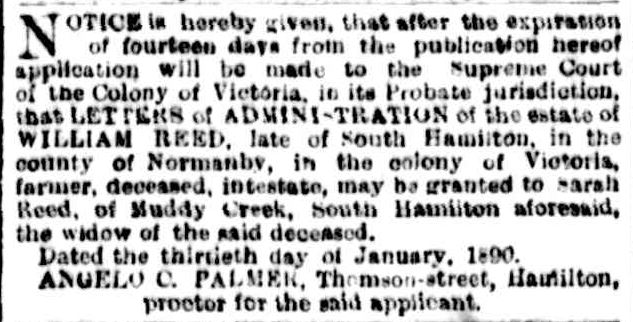 Not taking a lead from his father in law, William passed away the following year, on December 23, 1889, intestate. William’s two brother-in-laws William Burgin and my ggg grandfather James Harman, lodged applications to administer the estate. However, William’s wife Sarah was granted administration. The notice, below, said William was from South Hamilton while Sarah was from Muddy Creek, South Hamilton.
