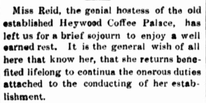 Vanda Savill’s book Dear Friends, Heywood (1976) mentions Isabella Gilhome and her sister Eliza Reid ran the coffee palace owned by the Reid family. It’s hard to establish when that was. A newspaper article from the Portland Guardian in 1914 mentions Miss Reid as the hostess, however that could have been her sister Eliza.