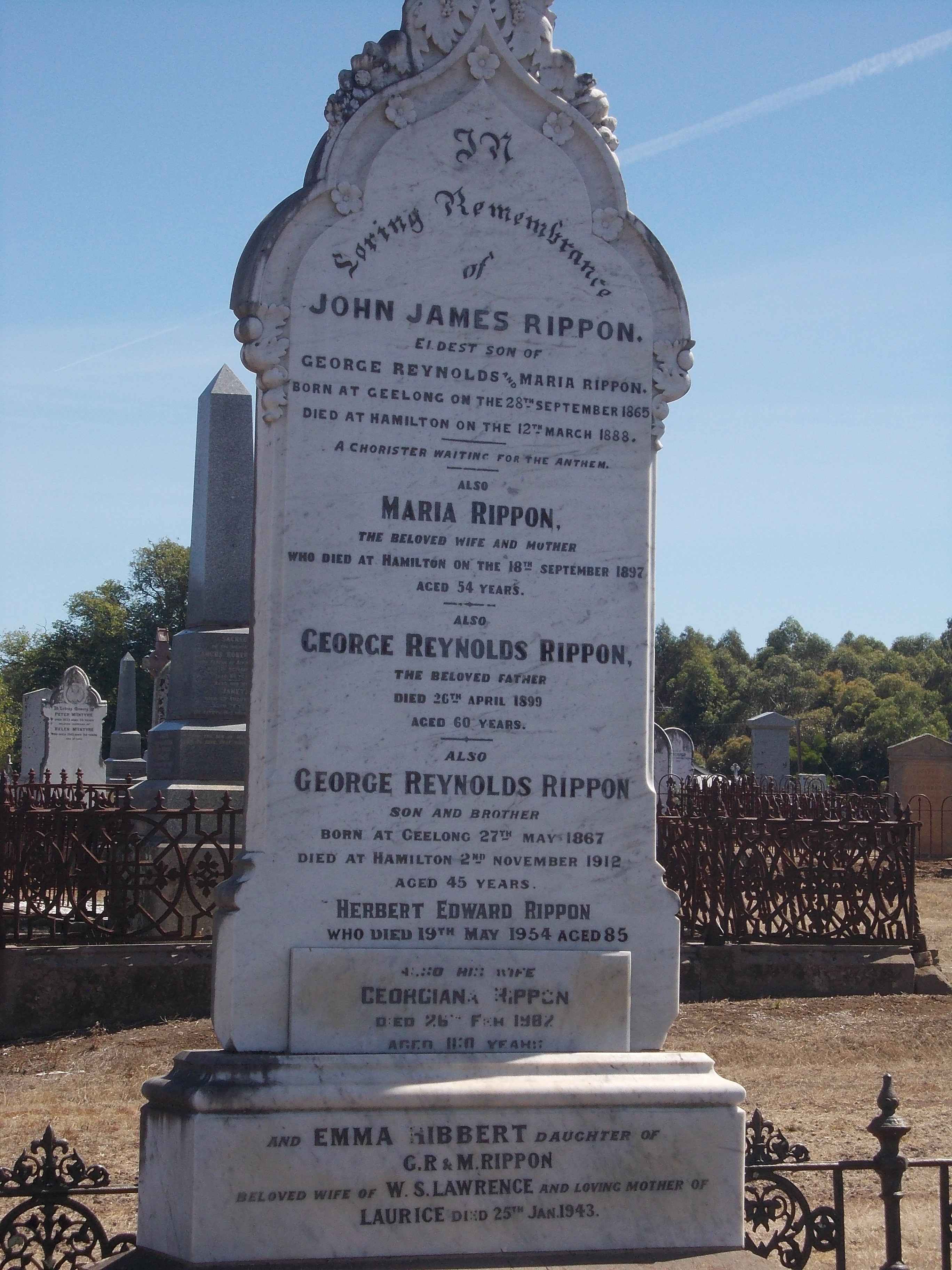 George was sick for most of 1912, having contracted a disease while in NSW. He succumbed on 2 November 1912. When the news of his death reached the citizens of Hamilton, flags around the town flew at half-mast. George never married and was buried in the Rippon family plot at the Hamilton (Old) Cemetery.